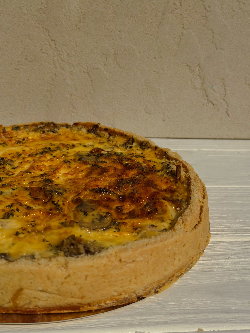 Склад: борошно, яйця, масло вершкове, курка, шампіньйони, перець, сіль, твердий сир, вершки 18%, молоко, семена льону.